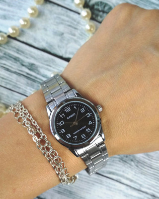 Предлагаем купить наручные часы Casio LTP-V001D-1B в г. Абакан. Это классические женские часы из коллекции Collection Women. Водозащита до 30 метров позволит защитить корпус от случайных брызг или капель дождя. Надежное минеральное стекло защищает часы от царапин и долго сохраняет первоначальный внешний вид. Минеральное стекло более устойчиво к появлению небольших царапин и потертостей, хорошо может выдержать небольшие удары и падения. Даже если поцарапаете стекло, его легко можно отполировать в часовой мастерской и вернуть им прежний вид. Корпус часов изготовлен из стали, механизм — кварц. Кварцевые часы всегда точнее механических. В среднем, погрешность хода составляет 20 секунд в месяц. Кварцевые часы не нужно заводить, только менять батарейку раз в несколько лет.