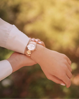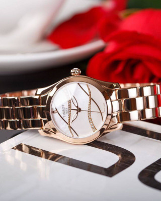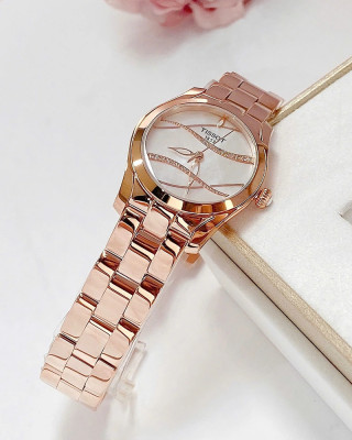 Швейцарские часы из коллекции T-Lady, как изящный аксессуар, подойдут к любому наряду: они способны освежить повседневный образ и дополнить роскошное платье, выбранное по особому случаю. Стрелки в виде листьев привлекают внимание к лаконичному белому циферблату, который интересно сочетается со стальным браслетом бронзового цвета.